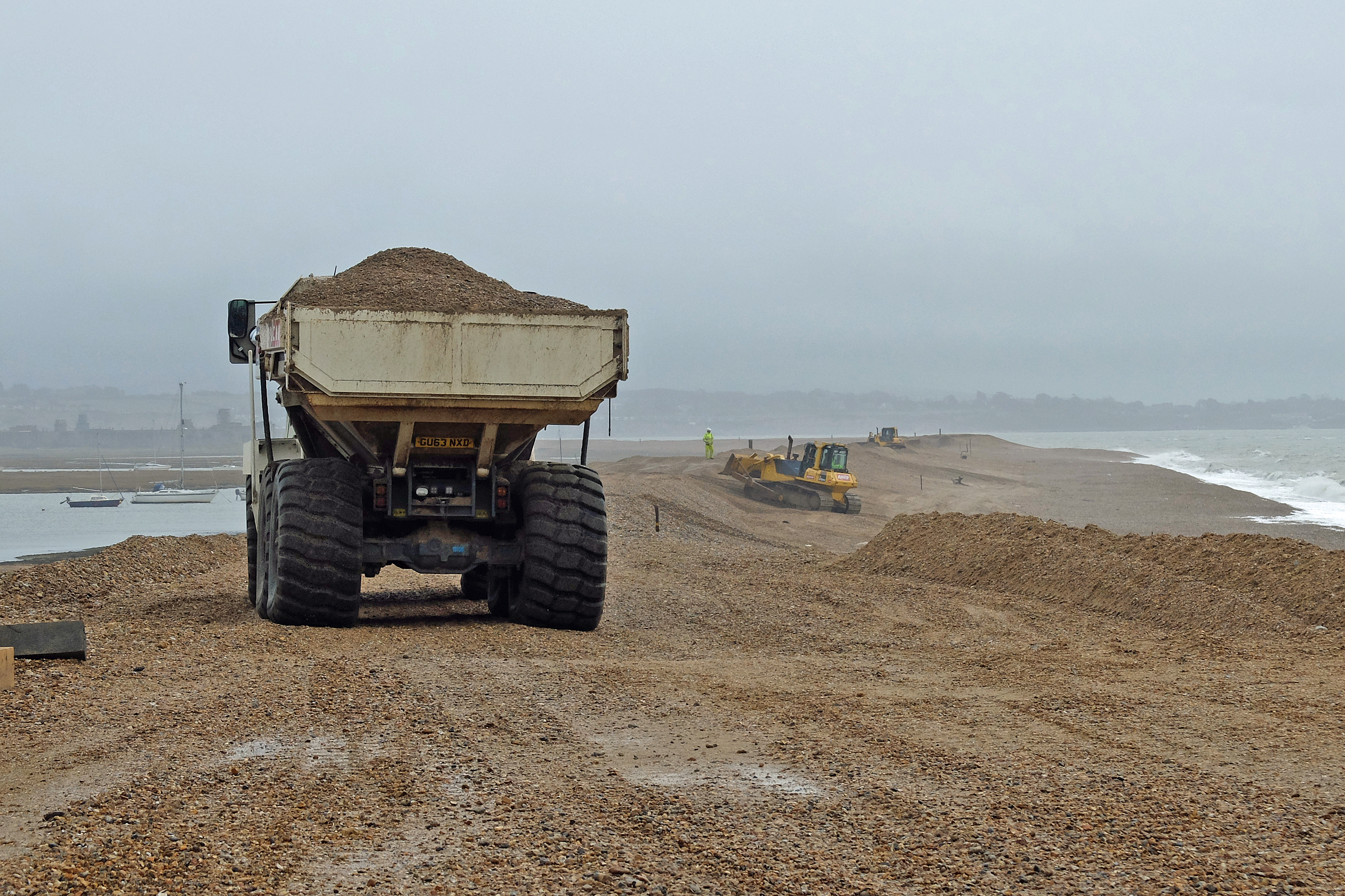 Eeeee it’s grim dahn Souff! I stepped out of Snickers into driving rain and a 40 mph head wind. They kept me company for a good few hours as I rounded the storm damaged sea wall protecting the marshes clearly devoid of an expected hoard of twitchers. As I approached Keyhaven it resembled a desolate outpost from a Dickensian novel and not a twee sailing village. Mercifully the rain abated as the marshes passed and what was left of Milford on Sea approached. Huge tipper trucks usually seen frequenting quarries greeted me as they inched their way along to Hurst Castle dumping shingle to repair the spit which had been breached in many places (photo).
