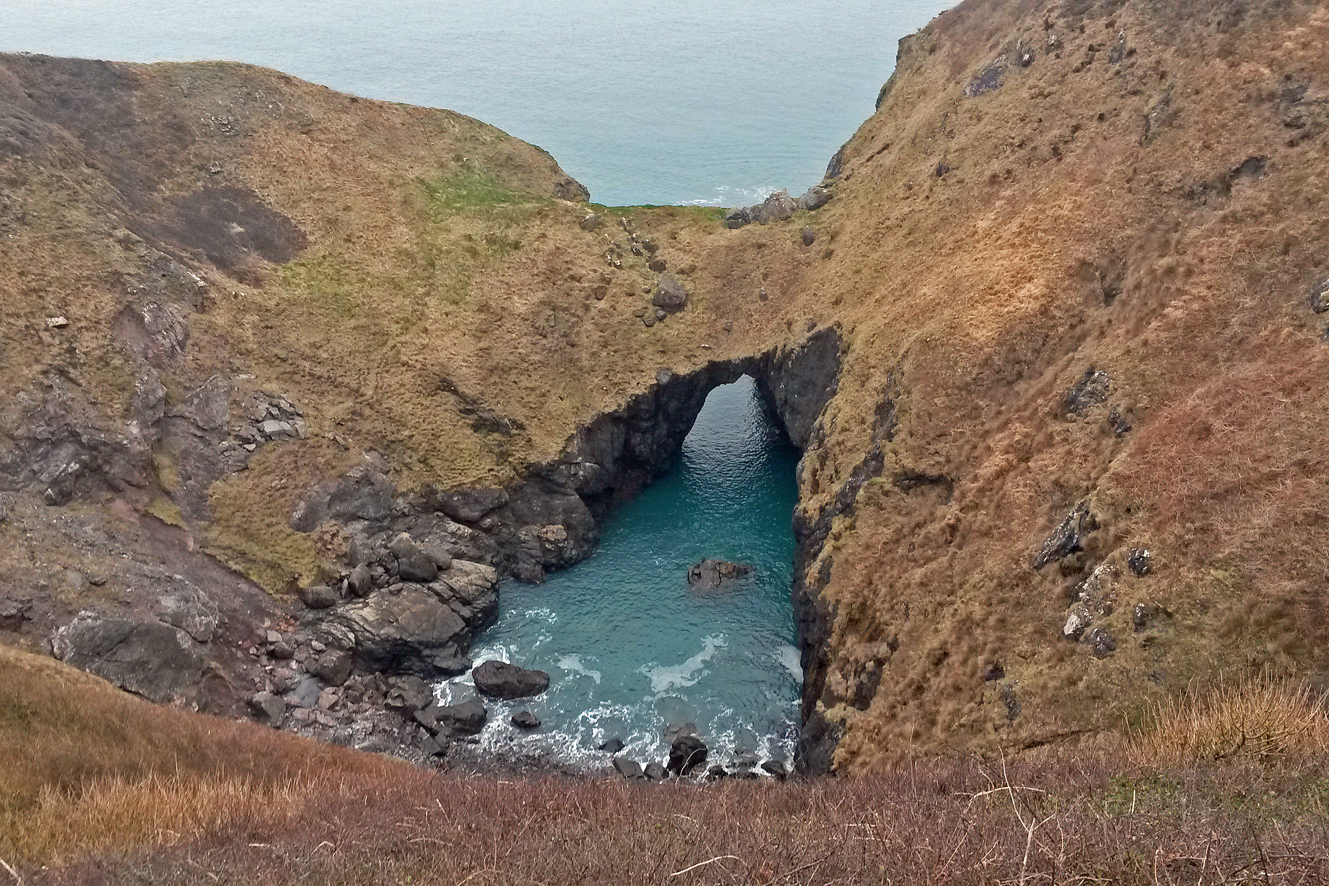 From Coverack I climbed over the cliffs to moorland like terrain. I met a few fellow walkers for a quick chat and sat and ate my lunch in the shadow of a deserted look out post at the disturbingly named Black Head. At Cadgwith the path was perilously close to the edge of the spectacular Devils Frying Pan (photo) and it was just a short walk round to the Lizard and a meeting with Sharpie for a few poses at my first compass landmark – the Southern most point of the British mainland. In celebration we enjoyed a few jars at the local hostelries and a damn good fish and chips back in the van.