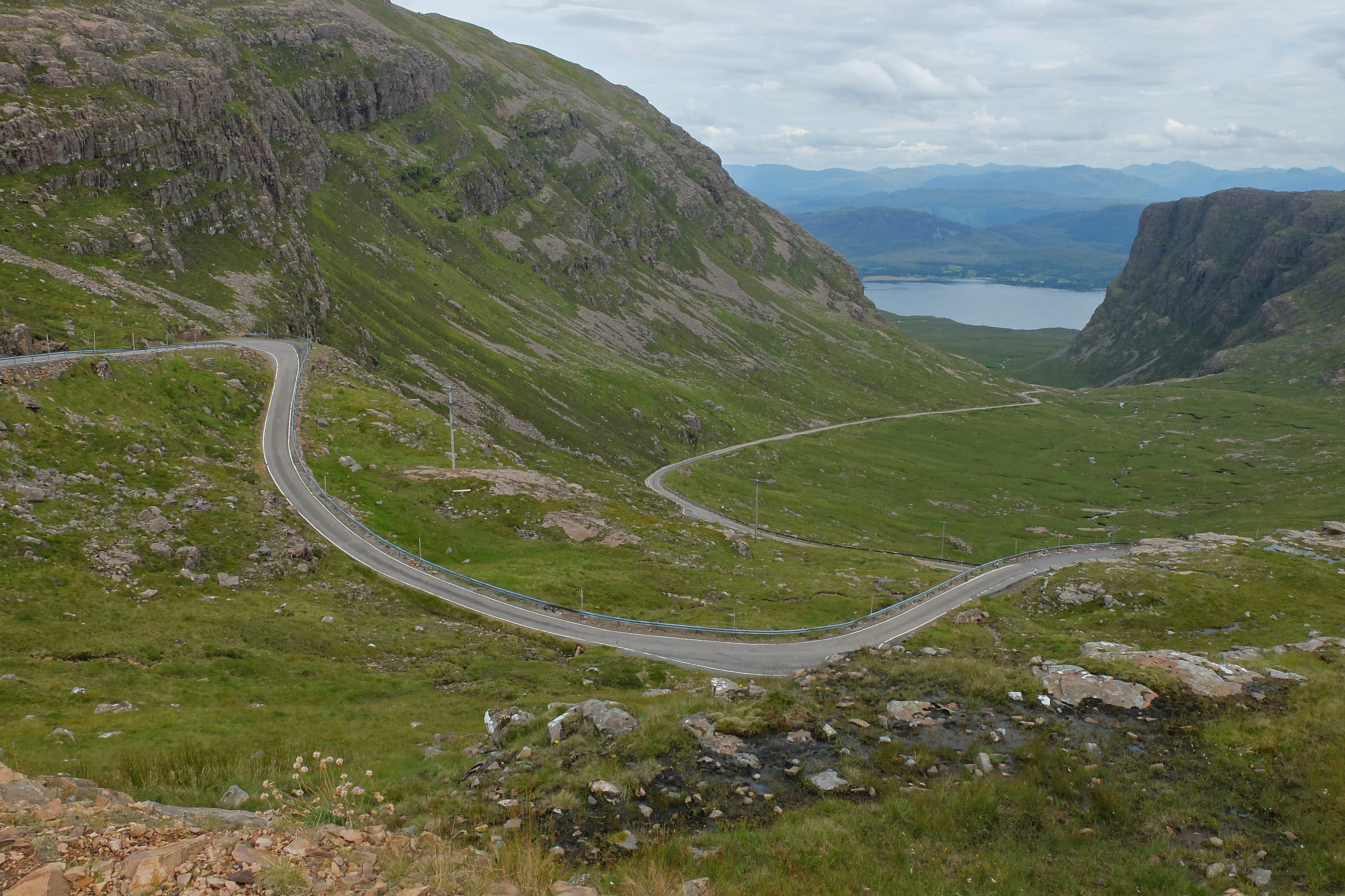 The road was heavily populated with tourists, some of whom clearly had no idea how to properly use passing places or reverse a car and as the pass wasn’t inordinately steep I was a little surprised to see some fairly abject vehicle manoeuvring going on further up the road. However, the views from the top were grand both back to the East, where the road itself made an impressive sight winding its way down into the valley below and to the West where the coast opened out to reveal Skye and the Wester Ross shoreline far below.