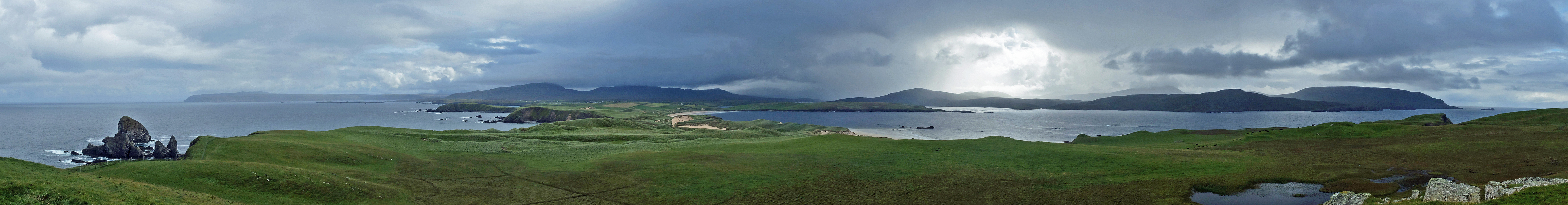 After a leisurely hour waiting in the cool sunshine, John the ferryman took me and some of the clearly happy and relieved returning cyclists over to Durness. I briefly met up with Jeff and Jenny to dump my rucksack for a lightweight afternoon around Feraid Head. Please excuse me the nerdyness of this next bit: The geology had starkly changed the landscape and the hard Pre-Cambrian Lewisian Gneiss of Cape Wrath now gave way to flatter more fertile land of the Cambro-Ordovician Durness Limestone. The prominent headland of Feraid Head is comprised of harder Moine Series metasediments and is joined to the mainland by Scotland’s largest expanse of dunes and corresponding deserted sandy beaches. A high point cairn at the North end of the headland gave me one of the best 360 degree views I have ever had as the headland narrowed back towards Durness.
