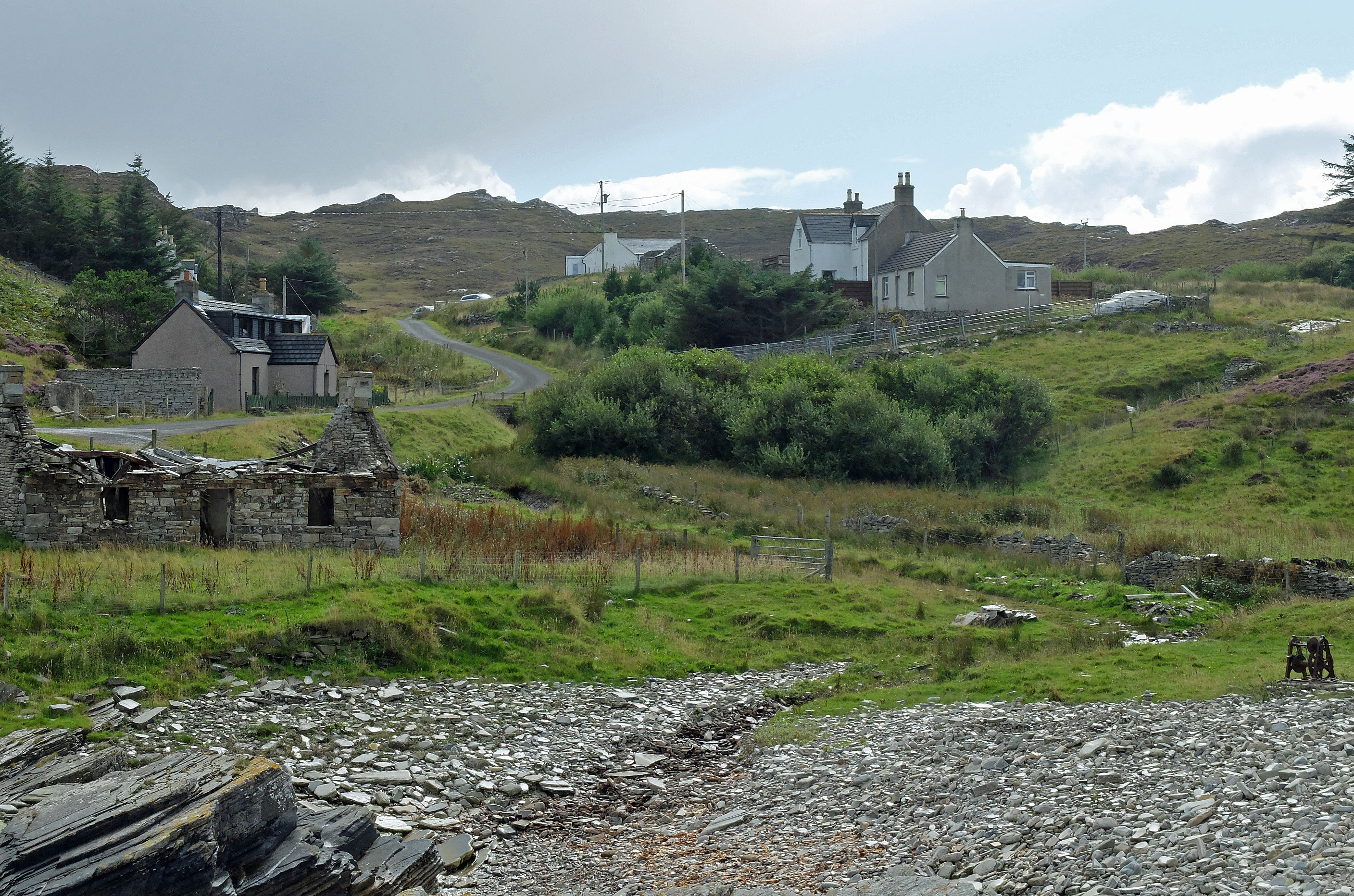 Sadly the scenery was as grey as the featureless blanket of cloud which covered it and I felt robbed of views and photo opportunities. By midday the rain closed in again enough for me to don the waterproofs for a soggy walk away from the main road and down the side of Loch Inchard. The last seven lane walking miles took me through the rather downcast fishing village of Kinlochbervie with its oversized fish market, noticeably devoid of activity. The next villages of Oldshoremore and finally Blairmore told me that wilderness was approaching and you could feel it.