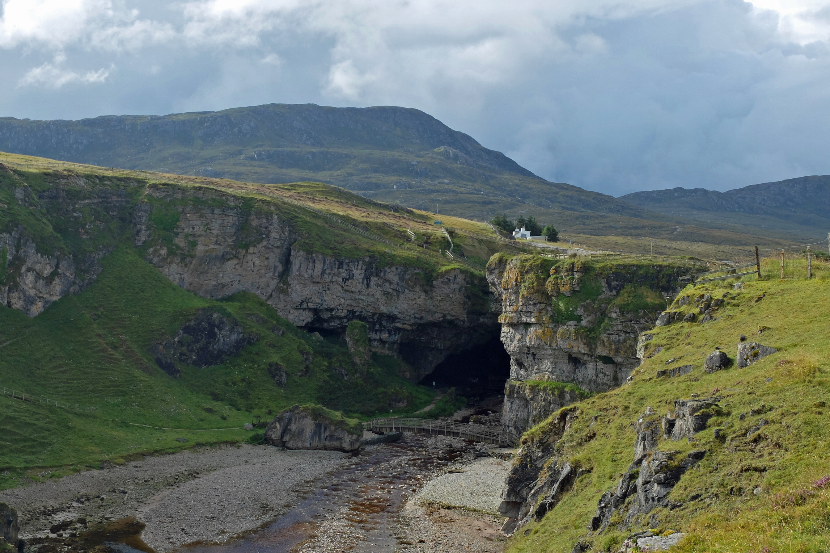 After my cross-country adventure rounding Cape Wrath and Feraid Head, it was sorely disappointing to have to get back to road walking. So to up my spirit I gave myself a small early departure from the tarmac and dropped down to have a quick look inside Smoo Cave. Sadly the photogenic waterfall chamber was closed due to a storm damaged walkway. Bertha was beginning to annoy me now, so I climbed my way back to the road and made my way South along the banks of Loch Eriboll with a metaphorical cloud over my head.