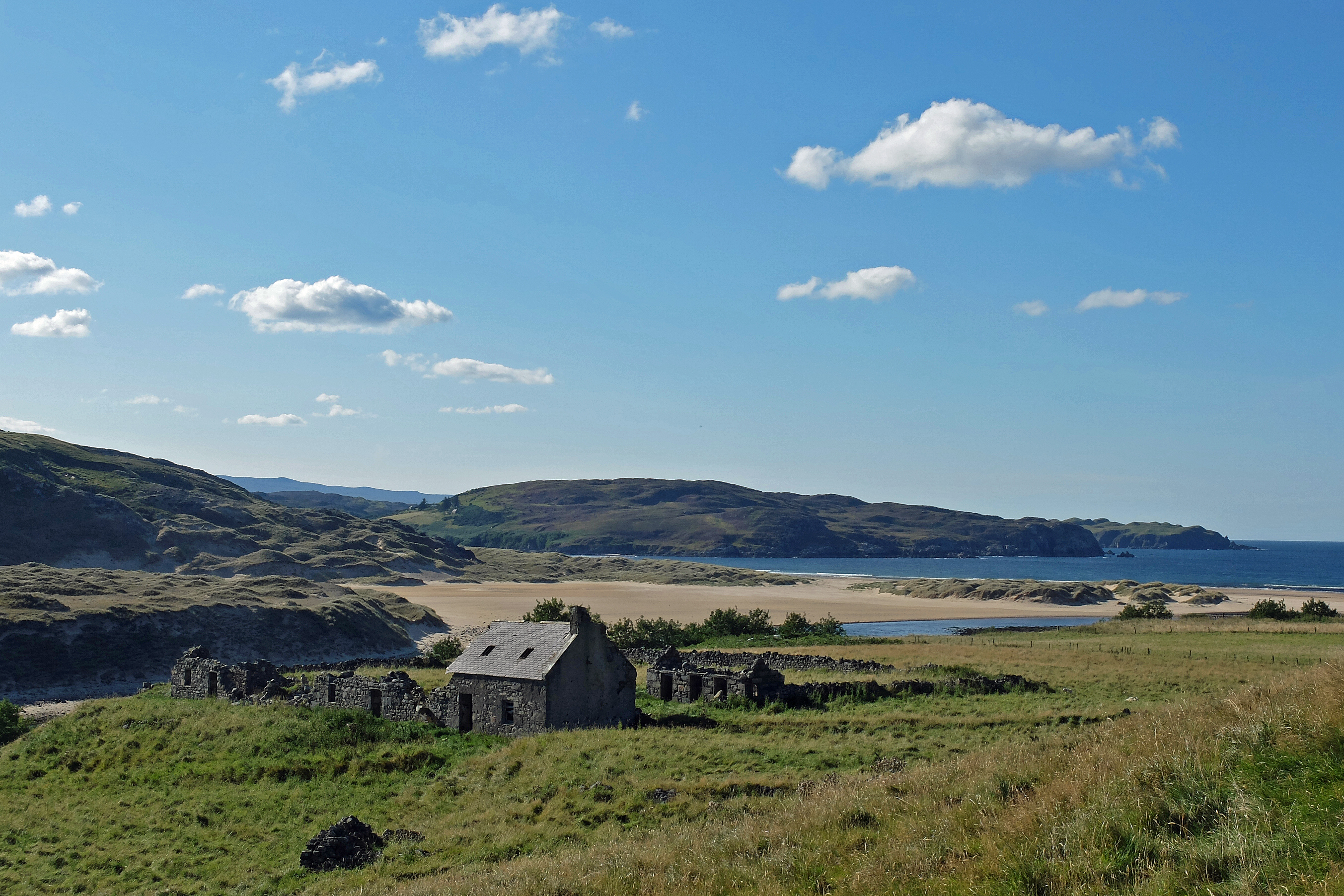 The road consisted of one slow climb and drop after another. Each one felt steeper and tougher than the one before. In truth they weren’t, but for some reason I was clearly tiring. The scenery had lost its rugged edge and the number of “wow” moments had fallen back as cultivated fields and gentler crags with low boggy moorland hills took over. By the time I arrived in Bettyhill I was already missing the West coast and this area also seemed to have lost its appeal to the band of tourists who had kept me company for the last month or so. The end of the holiday season was nigh, but I also felt that the beauty was diminishing too. It was a shame for Bettyhill because the estuary was utterly beguiling and Torrisdale Bay could easily have doubled for a tropical resort if it wasn’t for the lack of palm trees and a chill East wind on my face.