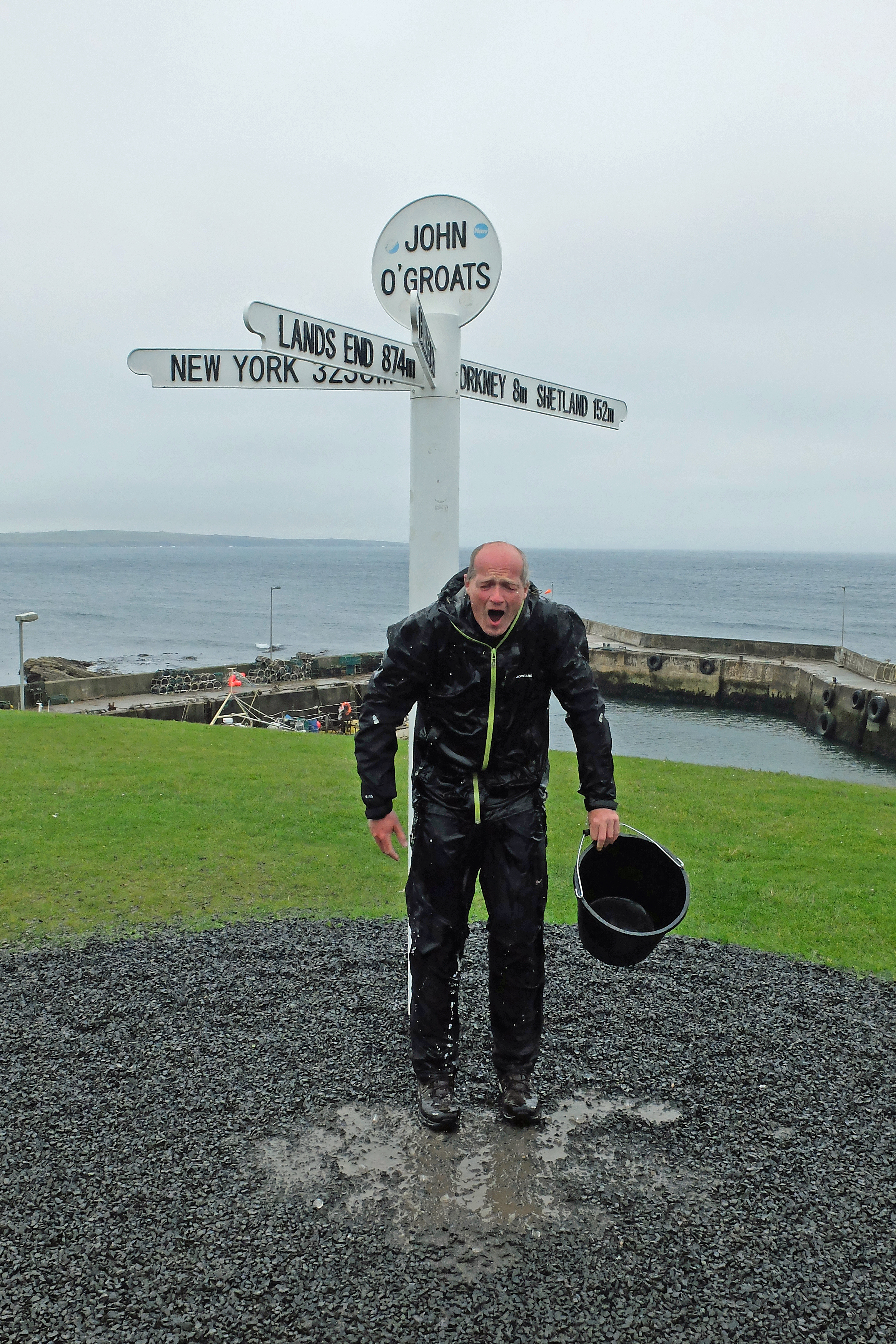 Now and again the gusts stopped me dead in my tracks and it was an uphill battle to make progress, but after a quick break for calorie loading behind the shelter of a high dry-stone wall the rain finally abated and I could make my way to John O’Groats for a posh coffee with Mike at the cafe. Here we met up with two guys, Tom & Rob, from Derbyshire who had impressively just cycled LEJOG in ten days. They were collecting for the MS Society and were rightly basking in the post match glow of completing something well beyond my capability. With the appearance of a bucket of ice filled water for their end-to-end celebratory duty it dawned on me that I too had been nominated to join in the charity social media led craze sweeping the nation and do ‘The Ice Bucket Challenge’. Without wanting to steal any of their thunder I took my turn and opportunity to fulfil my challenge and to dowse myself under the well photographed signpost. Recent conditions must have toughened me as I’m sure it felt warm….as if!