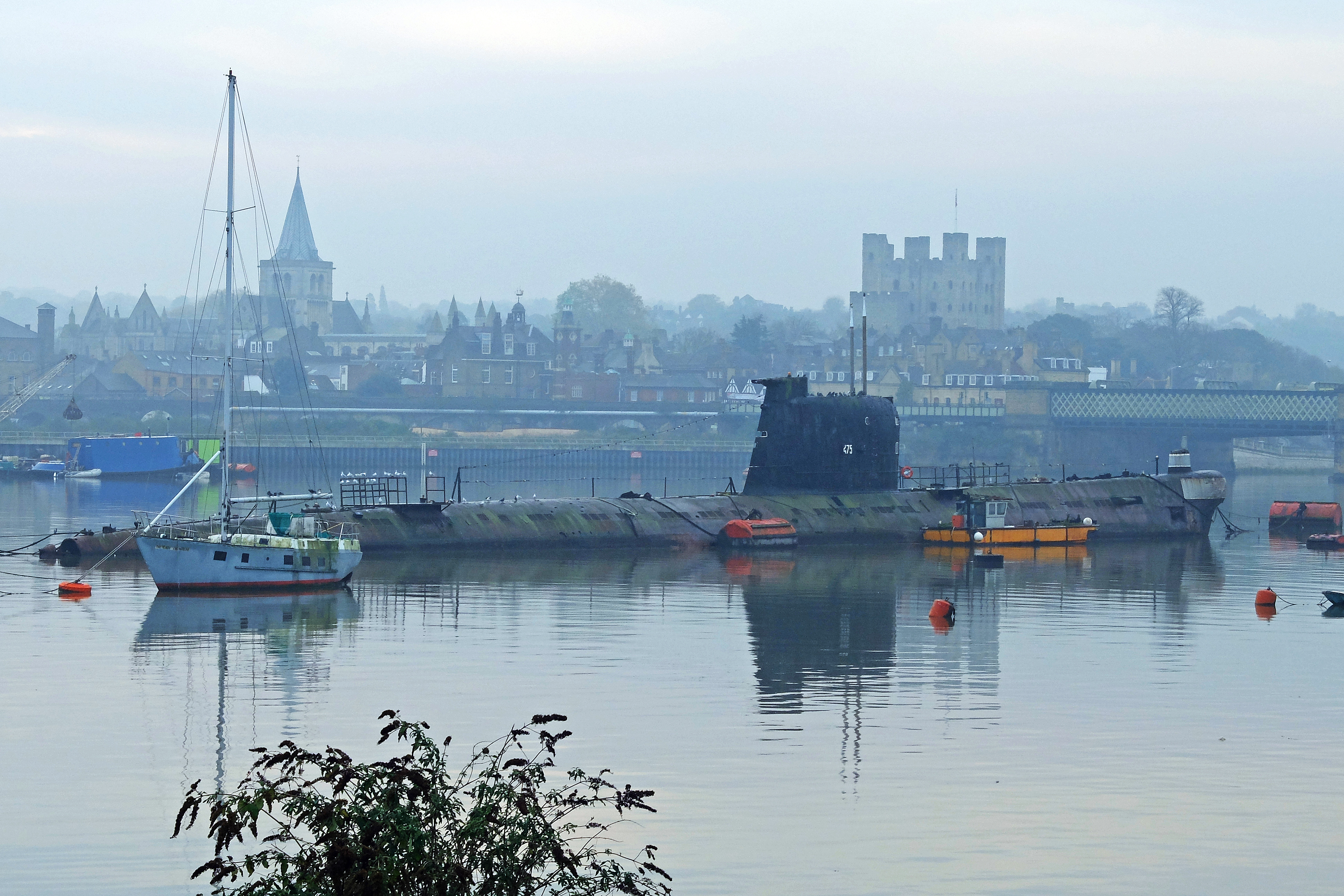 It was a cold, misty but thankfully dry start back on the Saxon Shore Way. For a change I found myself following a shoreline, even if was only the shore of the River Medway. Nonetheless it was better than a sea-wall with no sea in sight or unkempt sticky fields with pylons for a view.  DSCF5903This short stretch of narrow sandy shingle took me through the quaint villages of Lower and Upper Upnor and on towards Strood and Rochester with the peculiar sight of a dilapidated former Soviet Navy submarine moored and gently rotting away in the foreground to the misty cathedral and castle framed background of an ancient town and former city.