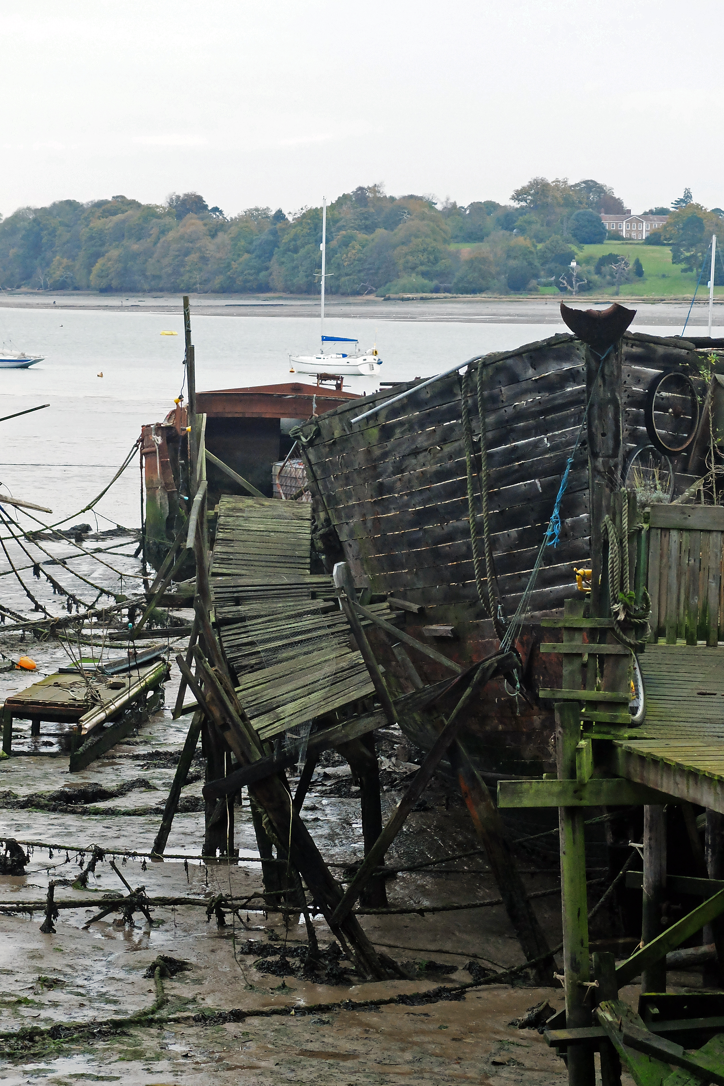 The river downstream of Chelmondiston village held an equally bleak but fascinating sight as dozens of old barges and boats, once trendy houseboat conversions, now stood in various states of decay. The odd one or two were still in use and well looked after, but the majority were now looking ready for reclamation by the river, their wooden stages and hulls tilting and rotting in the mud.